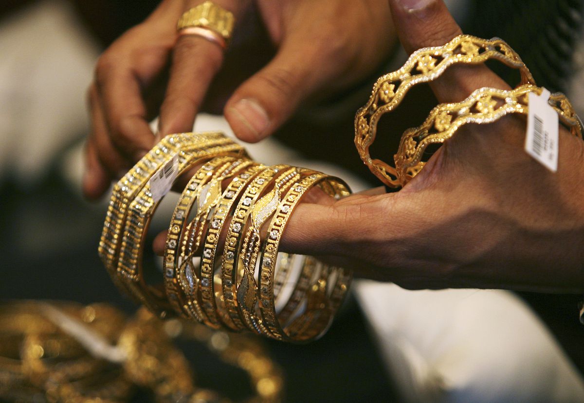 A shopkeeper shows gold bangles to a customer at a jewellery shop in Mumbai November 4, 2009. REUTERS/Arko Datta