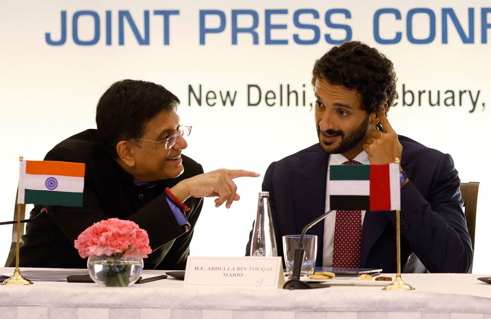 India's Minister of Commerce and Industry, Piyush Goyal talks to Abdulla Bin Touq Al Marri, Minister of Economy of the United Arab Emirates, (UAE), during their joint news conference in New Delhi, India, February 18, 2022. REUTERS/Adnan Abidi