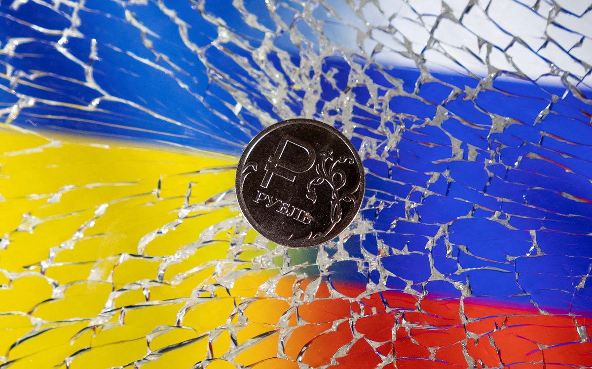 Russian Rouble coin is seen on a broken glass and displayed Ukrainian's and Russian's flags in this illustration taken, February 24, 2022. REUTERS/Dado Ruvic/Illustration/File Photo