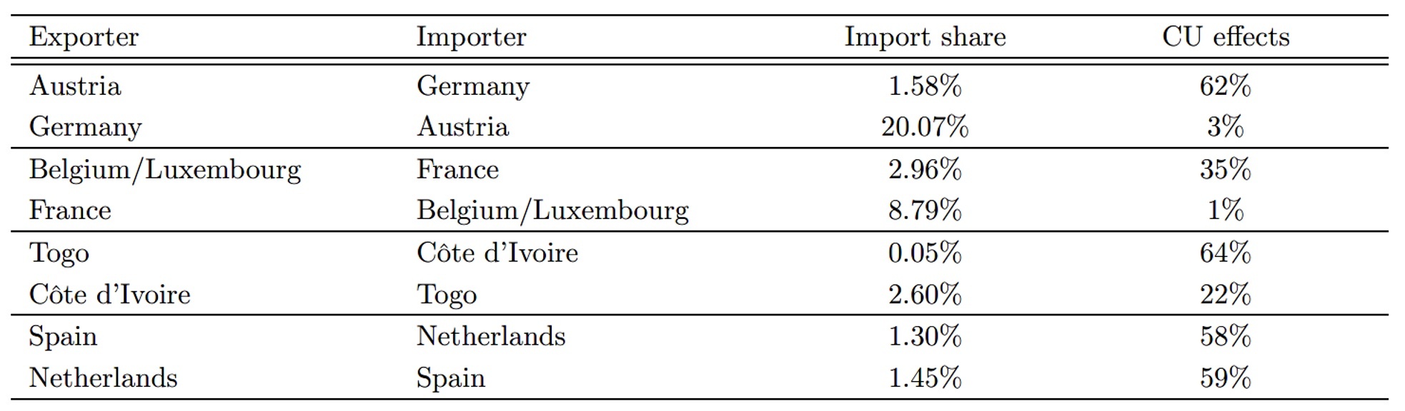 One implication of our results is that the trade effect of currency unions can be heterogeneous within country pairs and therefore asymmetric by direction of trade. For example, Table 1 shows that the effect is large for trade from Austria to Germany (62%). But it is only 3% for trade in the opposite direction from Germany to Austria (given a very large bilateral import share of 20.07%).